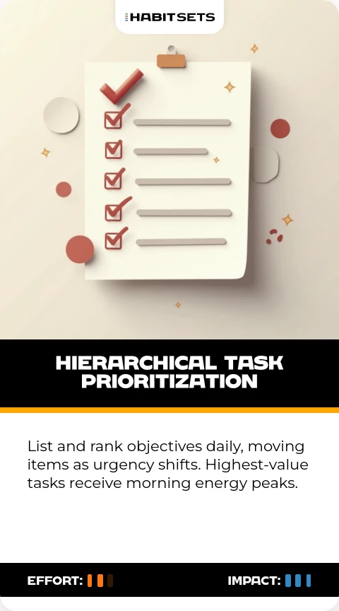 List and rank objectives daily, moving items as urgency shifts. Highest-value tasks receive morning energy peaks.