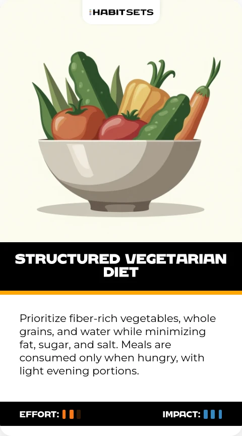 Prioritize fiber-rich vegetables, whole grains, and water while minimizing fat, sugar, and salt. Meals are consumed only when hungry, with light evening portions.