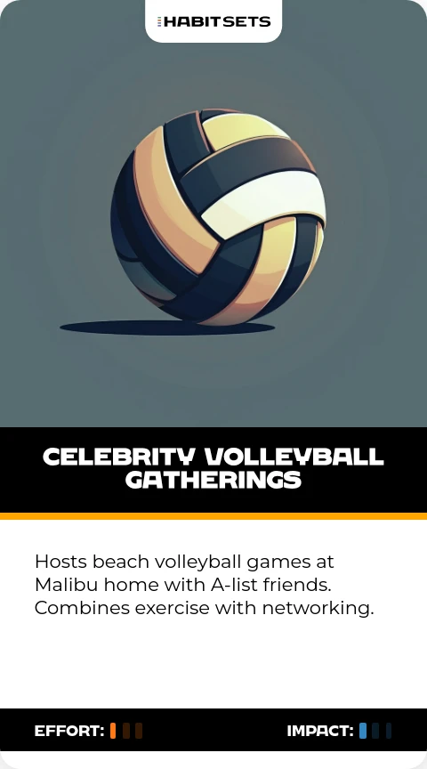 Hosts beach volleyball games at Malibu home with A-list friends. Combines exercise with networking.