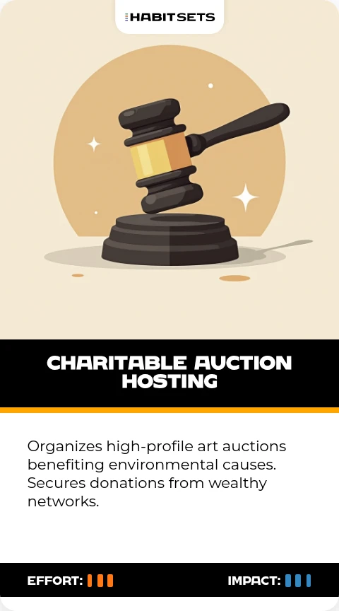 Organizes high-profile art auctions benefiting environmental causes. Secures donations from wealthy networks.