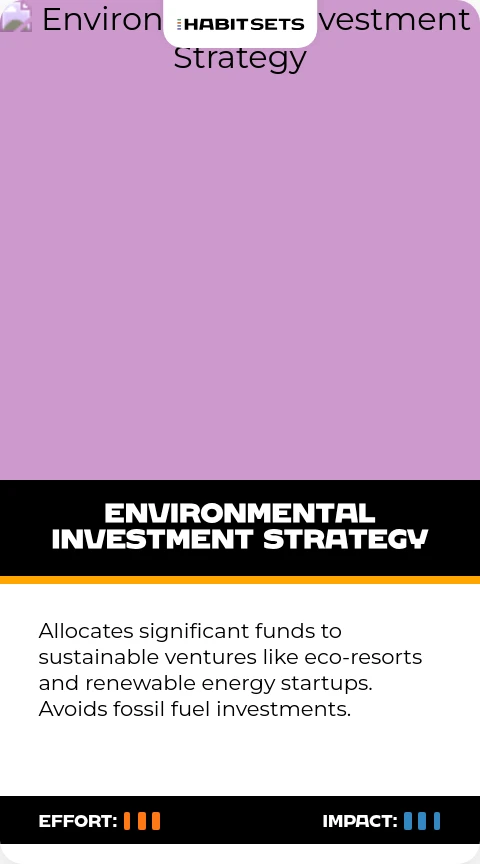 Allocates significant funds to sustainable ventures like eco-resorts and renewable energy startups. Avoids fossil fuel investments.