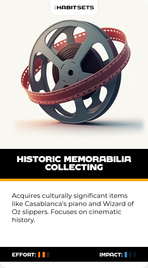 Acquires culturally significant items like Casablanca's piano and Wizard of Oz slippers. Focuses on cinematic history.