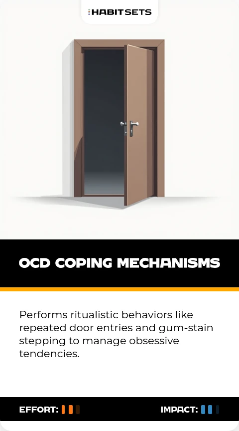 Performs ritualistic behaviors like repeated door entries and gum-stain stepping to manage obsessive tendencies.
