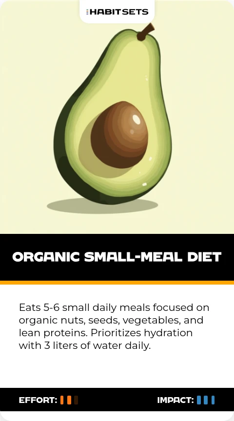 Eats 5-6 small daily meals focused on organic nuts, seeds, vegetables, and lean proteins. Prioritizes hydration with 3 liters of water daily.