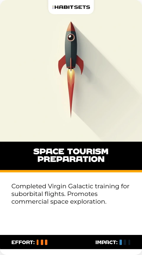 Completed Virgin Galactic training for suborbital flights. Promotes commercial space exploration.