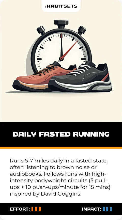 Runs 5-7 miles daily in a fasted state, often listening to brown noise or audiobooks. Follows runs with high-intensity bodyweight circuits (5 pull-ups + 10 push-ups/minute for 15 mins) inspired by David Goggins.