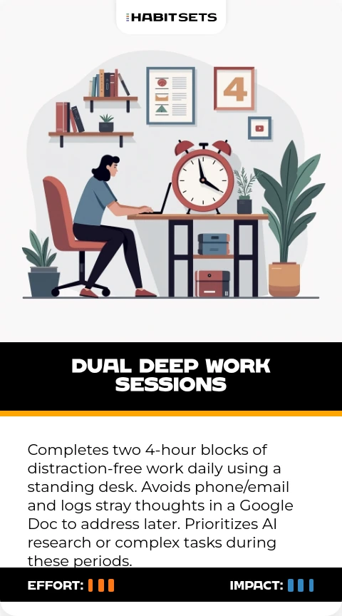 Completes two 4-hour blocks of distraction-free work daily using a standing desk. Avoids phone/email and logs stray thoughts in a Google Doc to address later. Prioritizes AI research or complex tasks during these periods.