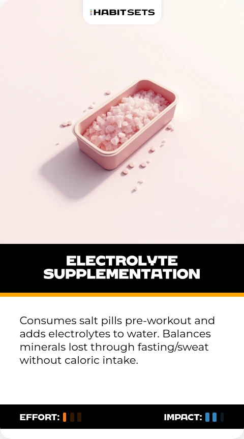 Consumes salt pills pre-workout and adds electrolytes to water. Balances minerals lost through fasting/sweat without caloric intake.