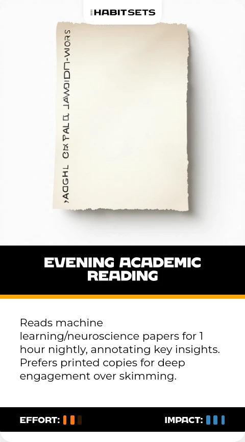 Reads machine learning/neuroscience papers for 1 hour nightly, annotating key insights. Prefers printed copies for deep engagement over skimming.