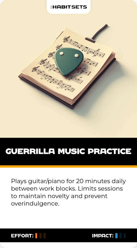 Plays guitar/piano for 20 minutes daily between work blocks. Limits sessions to maintain novelty and prevent overindulgence.