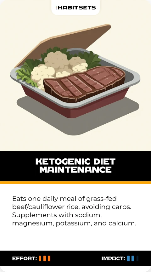 Eats one daily meal of grass-fed beef/cauliflower rice, avoiding carbs. Supplements with sodium, magnesium, potassium, and calcium.