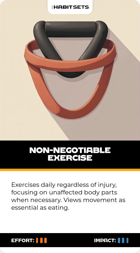 Exercises daily regardless of injury, focusing on unaffected body parts when necessary. Views movement as essential as eating.