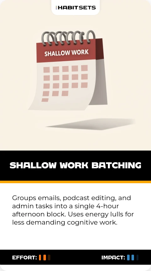 Groups emails, podcast editing, and admin tasks into a single 4-hour afternoon block. Uses energy lulls for less demanding cognitive work.