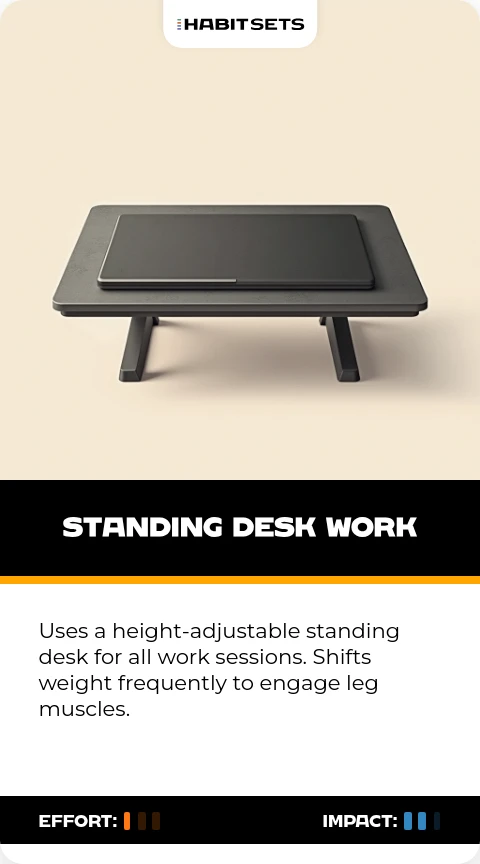 Uses a height-adjustable standing desk for all work sessions. Shifts weight frequently to engage leg muscles.