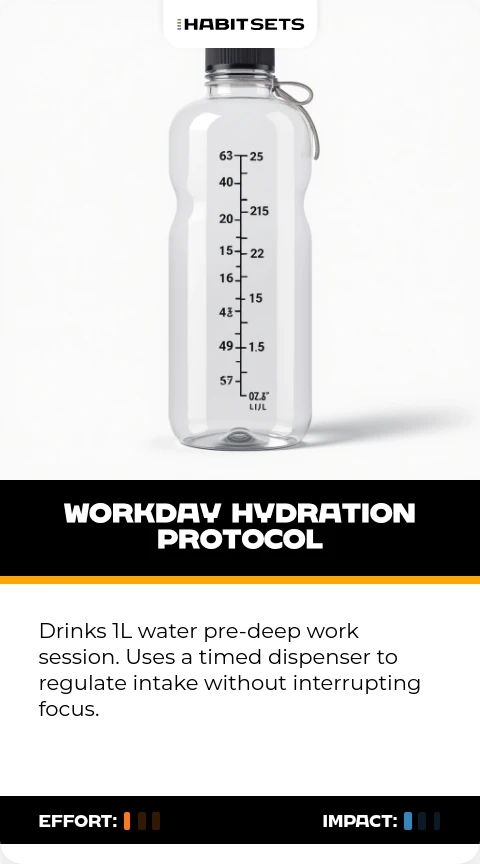 Drinks 1L water pre-deep work session. Uses a timed dispenser to regulate intake without interrupting focus.