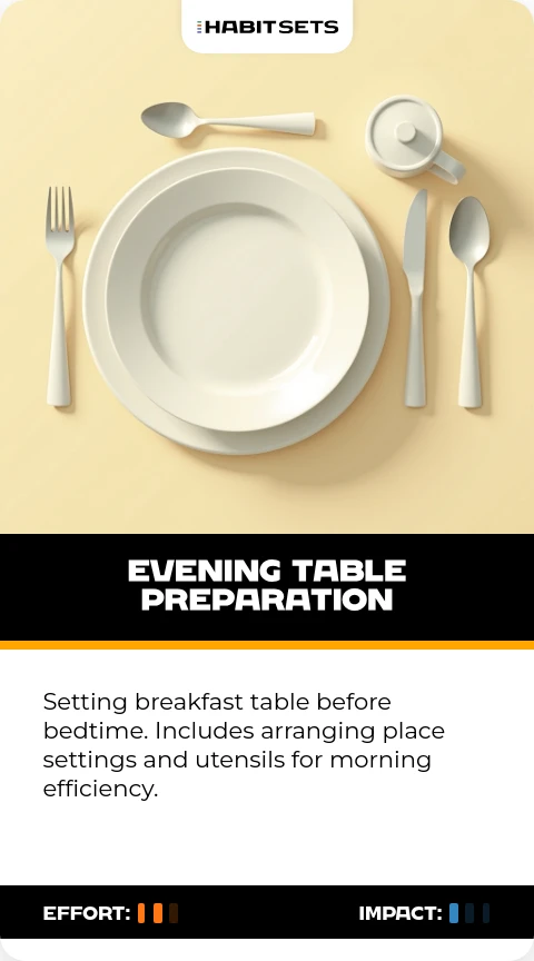 Setting breakfast table before bedtime. Includes arranging place settings and utensils for morning efficiency.