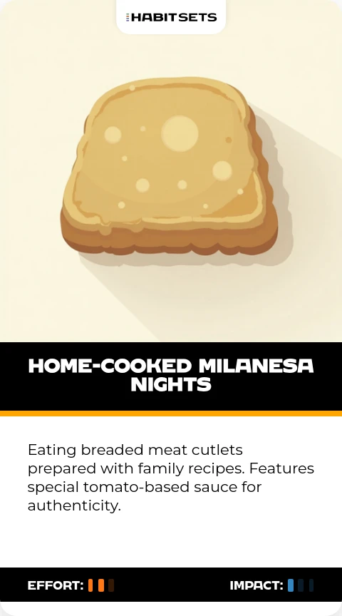 Eating breaded meat cutlets prepared with family recipes. Features special tomato-based sauce for authenticity.
