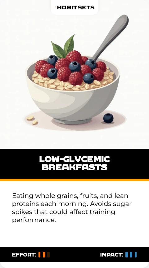 Eating whole grains, fruits, and lean proteins each morning. Avoids sugar spikes that could affect training performance.