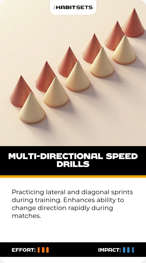 Practicing lateral and diagonal sprints during training. Enhances ability to change direction rapidly during matches.