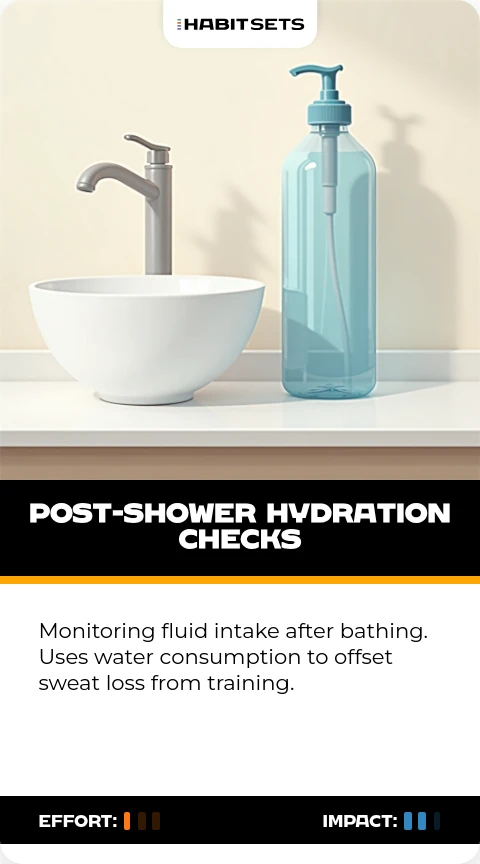 Monitoring fluid intake after bathing. Uses water consumption to offset sweat loss from training.