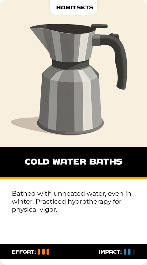 Bathed with unheated water, even in winter. Practiced hydrotherapy for physical vigor.