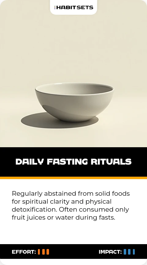Regularly abstained from solid foods for spiritual clarity and physical detoxification. Often consumed only fruit juices or water during fasts.