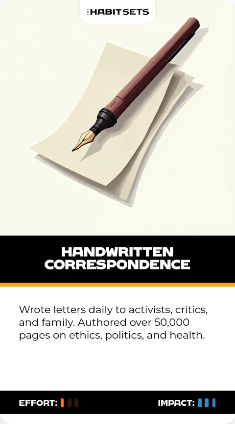 Wrote letters daily to activists, critics, and family. Authored over 50,000 pages on ethics, politics, and health.