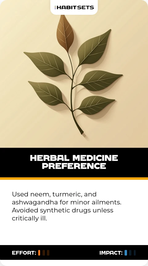 Used neem, turmeric, and ashwagandha for minor ailments. Avoided synthetic drugs unless critically ill.