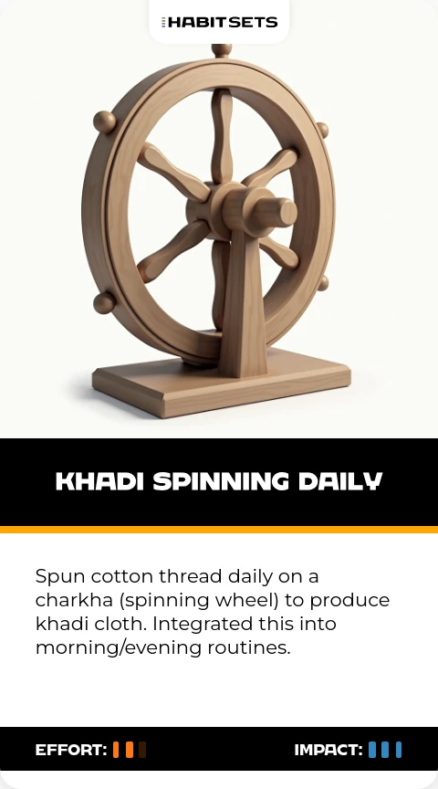 Spun cotton thread daily on a charkha (spinning wheel) to produce khadi cloth. Integrated this into morning/evening routines.