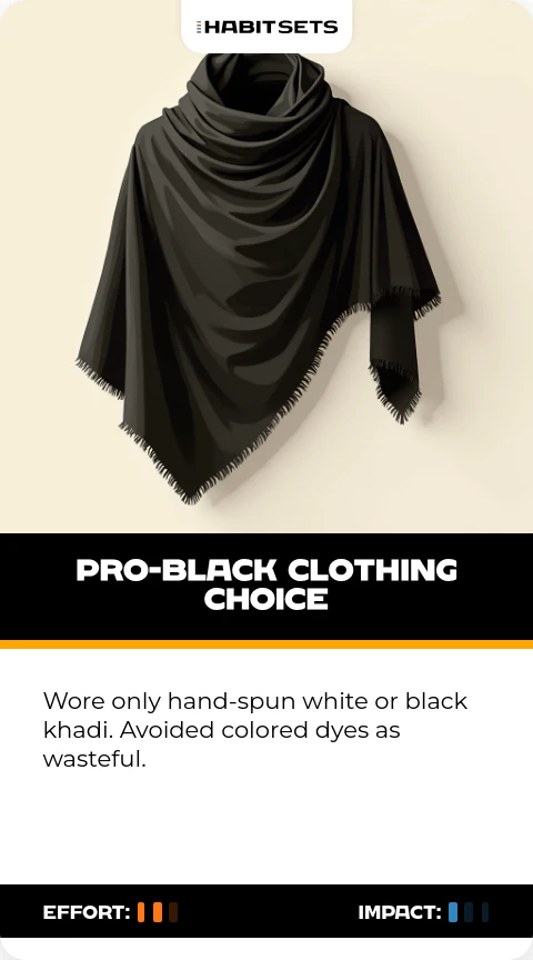 Wore only hand-spun white or black khadi. Avoided colored dyes as wasteful.