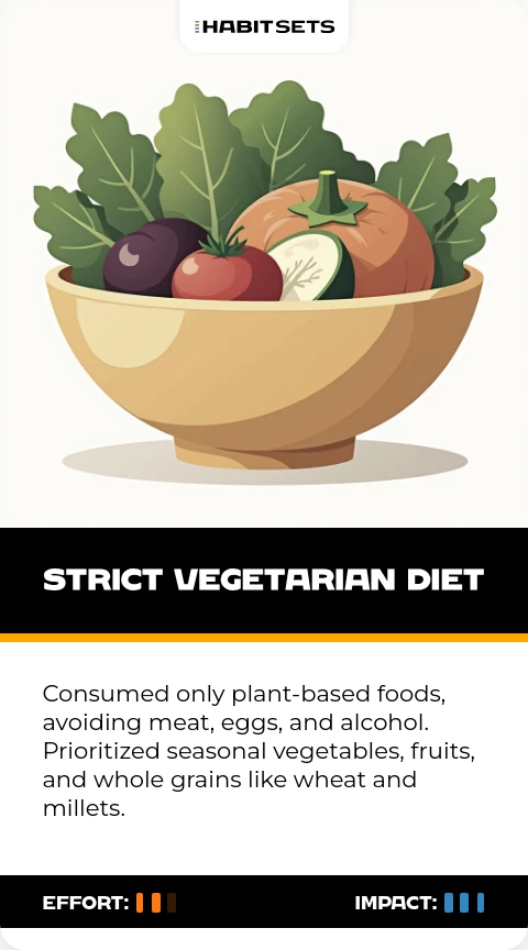 Consumed only plant-based foods, avoiding meat, eggs, and alcohol. Prioritized seasonal vegetables, fruits, and whole grains like wheat and millets.