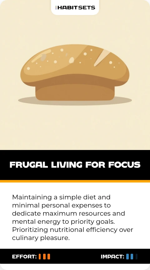 Maintaining a simple diet and minimal personal expenses to dedicate maximum resources and mental energy to priority goals. Prioritizing nutritional efficiency over culinary pleasure.