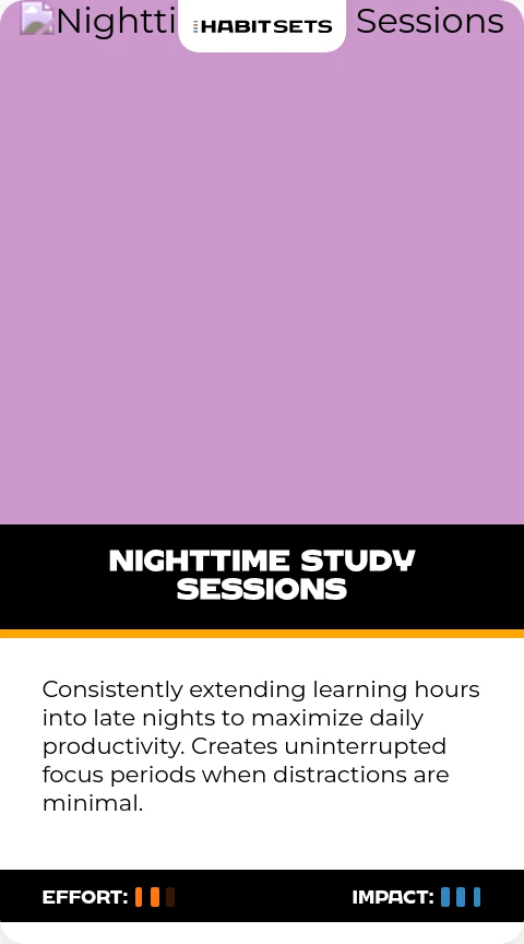 Consistently extending learning hours into late nights to maximize daily productivity. Creates uninterrupted focus periods when distractions are minimal.