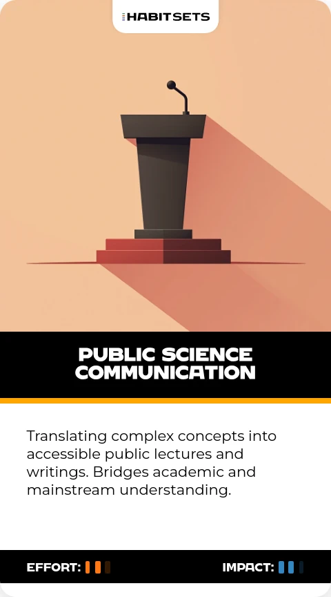 Translating complex concepts into accessible public lectures and writings. Bridges academic and mainstream understanding.