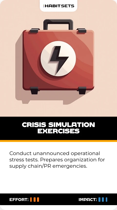 Conduct unannounced operational stress tests. Prepares organization for supply chain/PR emergencies.