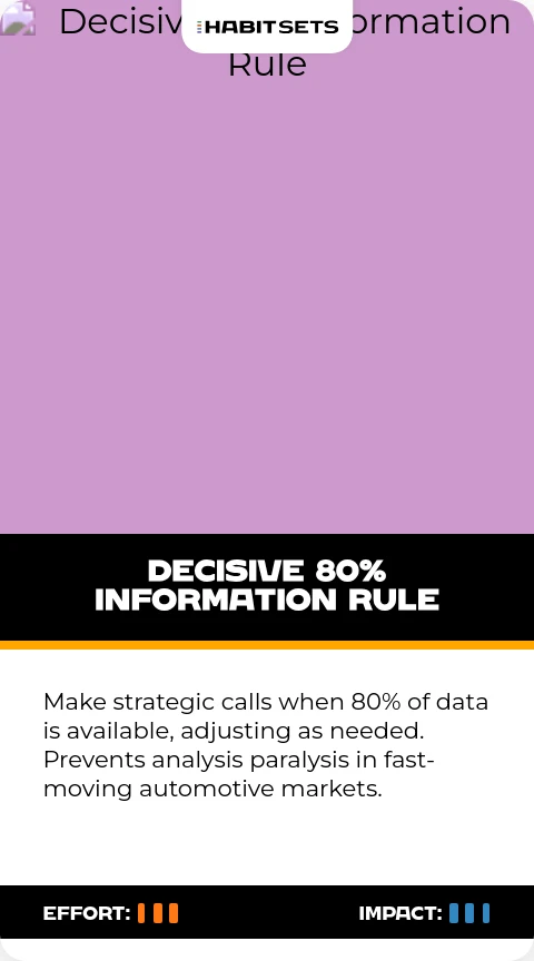 Make strategic calls when 80% of data is available, adjusting as needed. Prevents analysis paralysis in fast-moving automotive markets.