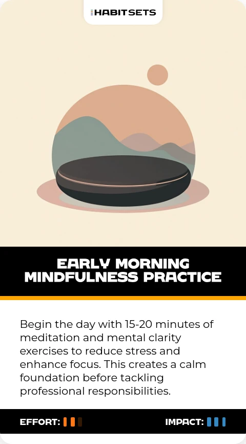 Begin the day with 15-20 minutes of meditation and mental clarity exercises to reduce stress and enhance focus. This creates a calm foundation before tackling professional responsibilities.