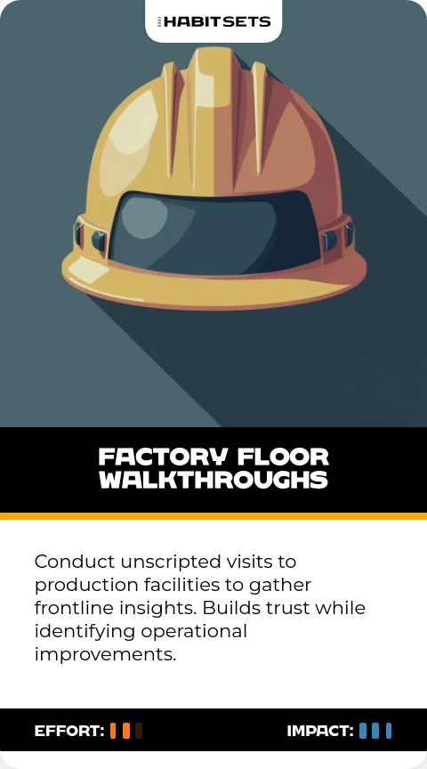 Conduct unscripted visits to production facilities to gather frontline insights. Builds trust while identifying operational improvements.
