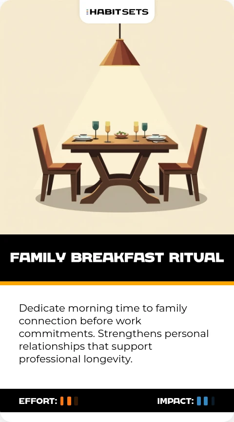 Dedicate morning time to family connection before work commitments. Strengthens personal relationships that support professional longevity.