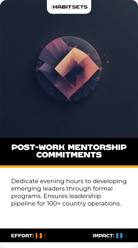 Dedicate evening hours to developing emerging leaders through formal programs. Ensures leadership pipeline for 100+ country operations.