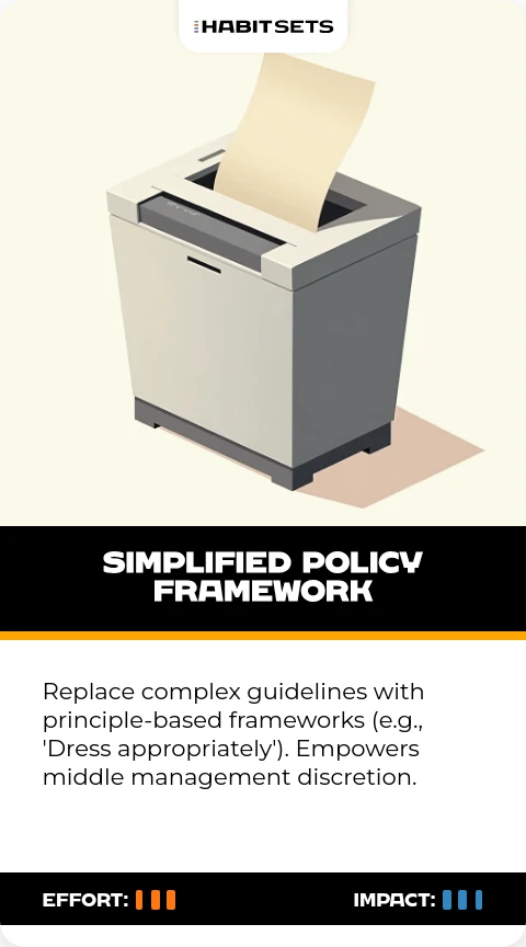 Replace complex guidelines with principle-based frameworks (e.g., 'Dress appropriately'). Empowers middle management discretion.