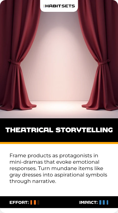 Frame products as protagonists in mini-dramas that evoke emotional responses. Turn mundane items like gray dresses into aspirational symbols through narrative.