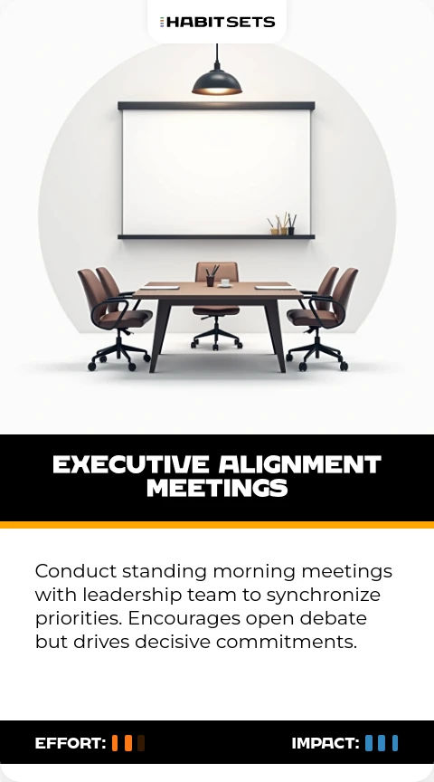 Conduct standing morning meetings with leadership team to synchronize priorities. Encourages open debate but drives decisive commitments.