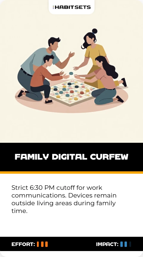 Strict 6:30 PM cutoff for work communications. Devices remain outside living areas during family time.