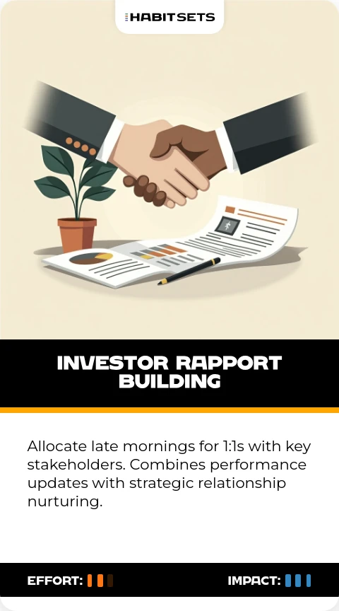Allocate late mornings for 1:1s with key stakeholders. Combines performance updates with strategic relationship nurturing.