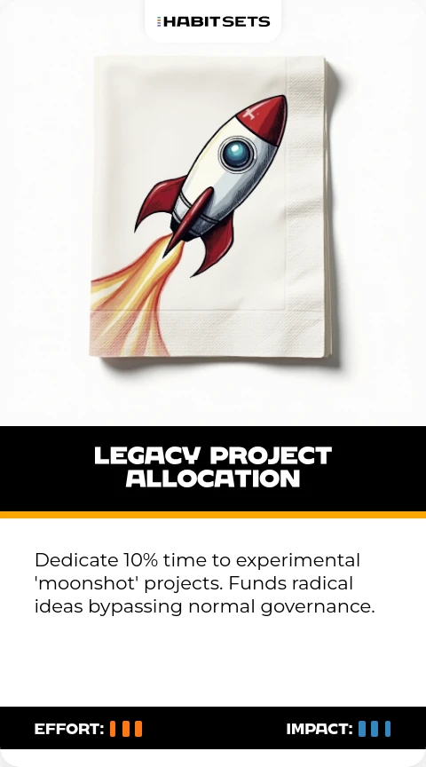 Dedicate 10% time to experimental 'moonshot' projects. Funds radical ideas bypassing normal governance.