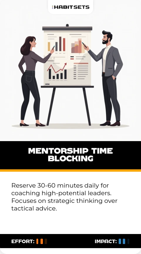 Reserve 30-60 minutes daily for coaching high-potential leaders. Focuses on strategic thinking over tactical advice.