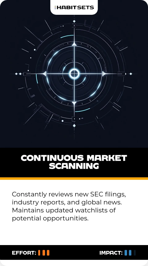 Constantly reviews new SEC filings, industry reports, and global news. Maintains updated watchlists of potential opportunities.