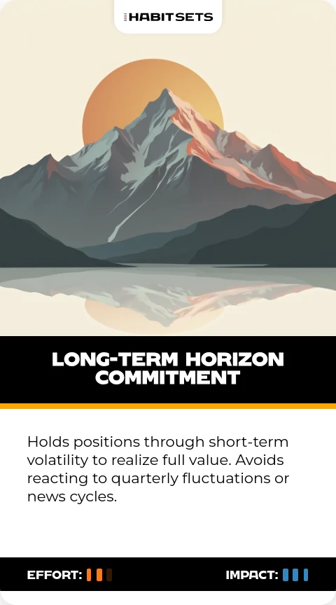 Holds positions through short-term volatility to realize full value. Avoids reacting to quarterly fluctuations or news cycles.