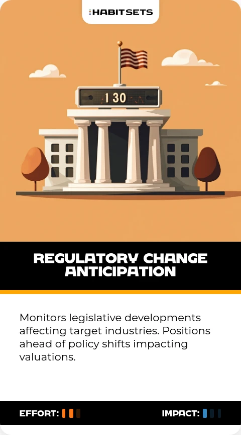 Monitors legislative developments affecting target industries. Positions ahead of policy shifts impacting valuations.
